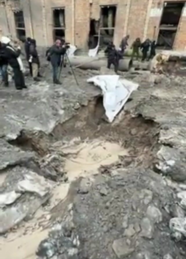 large crater in the ground, filled with muddy water, in front of a damaged brick building with several broken windows. There is white cloth partially covering the edge of the crater. A group of people, some wearing military-style clothing, stand near the edge of the crater and in front of the building. At least one person is holding a camera on a tripod and filming. Another person walks past the camera. The environment suggests a site affected by conflict or bombing. The overall atmosphere is one of investigation and reporting.