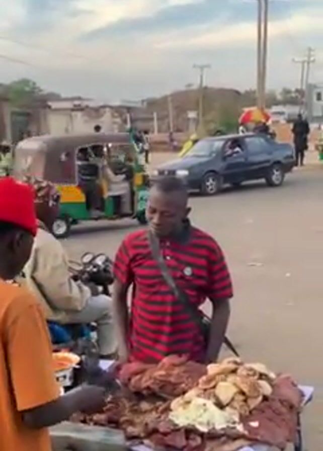 two men standing by a food cart. The food cart is filled with what appears to be grilled meat and cooked potatoes. The man closest to the camera is wearing an orange shirt and a red hat, and is buying food from the vendor. The vendor is wearing a red and black striped shirt and has a shoulder bag. The food cart is located on a street corner, and there are several motorcycles parked nearby. In the background, there are cars, auto rickshaws, and people walking around. The overall environment appears to be a busy street scene in an urban setting.