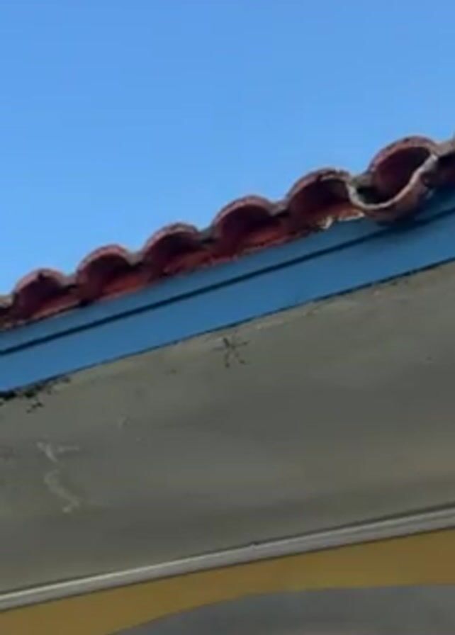spider clinging to the side of a building under the roof. The roof is made of curved, reddish-brown tiles over a blue band. The wall beneath is light gray with slight imperfections. The spider, gray with black and yellow markings on its legs, is stationary. The background is a clear blue sky.