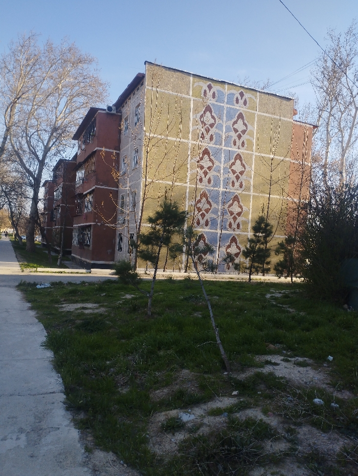 The image depicts a residential street scene in Chirchik, Uzbekistan. The central subject is a five-story apartment building, approximately 15 meters in height, with a prominent yellowish-beige facade. This facade is decorated with a large, vertically oriented ornamental pattern consisting of repeating light blue and reddish-brown geometric motifs within a grid framework. An attached section on the left side of the main building is reddish-brown, featuring multiple windows and an externally mounted air conditioning unit near the rooftop. Further to the left, a second, similarly styled reddish-brown residential building is partially visible in the background. The foreground includes a grey concrete sidewalk running along the left edge of the frame. Adjacent to the sidewalk is an unpaved area of ground, sparsely covered with green grass and exposed light brown soil. This area contains several young, slender, bare-branched trees and a few small evergreen shrubs. Scattered refuse, appearing as light-colored debris, is present on the ground. To the far left and behind the buildings, several mature deciduous trees with extensive bare branches are visible against a clear, light blue sky. Overhead power or communication lines traverse the upper right portion of the frame. No individuals or active interactions are present in the scene.