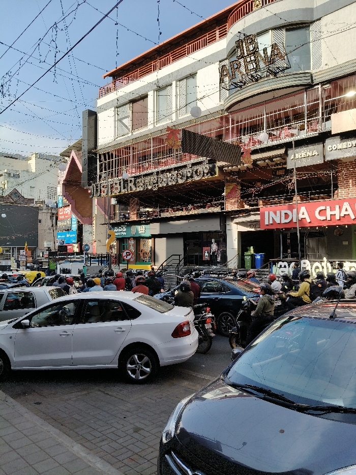 A busy urban street scene with dense traffic. Cars, motorcycles, and people crowd the road. Buildings with commercial establishments line the street, including "JustBLR Restoshop," "IB Arena," and "India Chat." The architecture includes both modern and older styles. Overhead wires crisscross the sky, adding to the congested atmosphere.