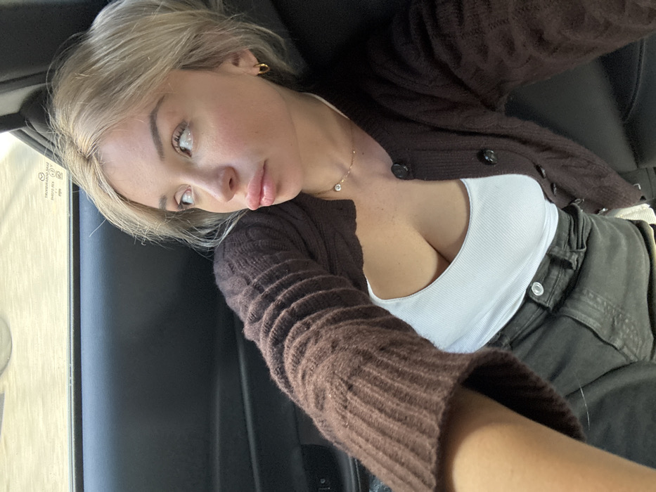 A woman with blonde hair and fair skin poses for a selfie. She's wearing a brown knit cardigan over a white tank top, and dark pants. A gold necklace and earrings are visible. The background suggests she's in a car, with a window and black interior visible. Her gaze is directed slightly upwards and to the side.