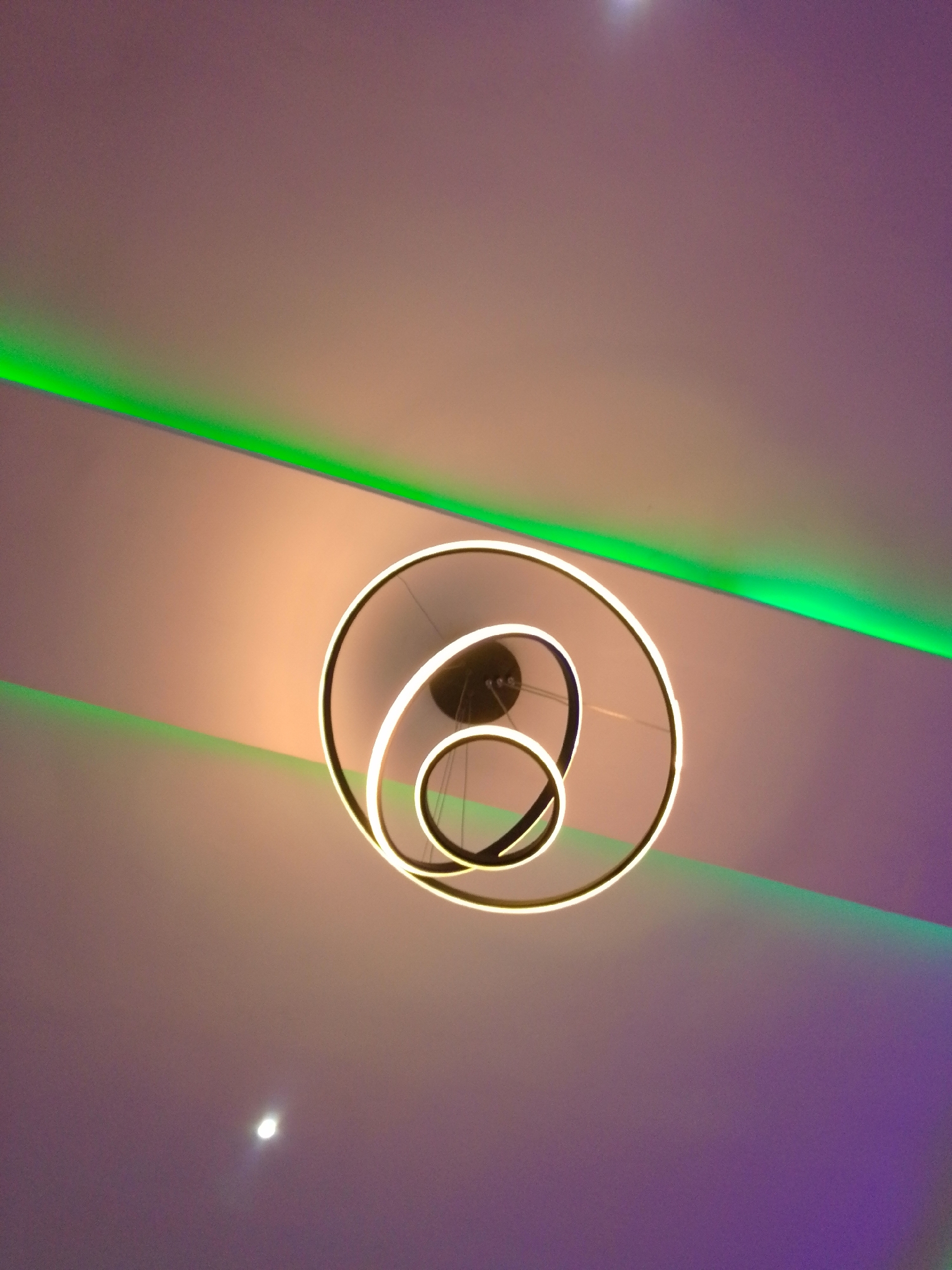 The image displays a modern, illuminated multi-ring chandelier suspended from a ceiling. The fixture features three concentric, dark-framed rings emitting a warm white light, positioned centrally within the upper frame. The ceiling, painted in a light hue, is dynamically lit with ambient colored lighting. A vivid green LED strip runs horizontally across the upper portion of the ceiling. Areas of the ceiling also display gradients of purple and a warm yellow-orange. Two small, bright circular light sources, consistent with recessed spotlights, are visible in the upper right and lower left sections of the ceiling. No individuals, additional objects, actions, or interactions are depicted. While situated in Uyo, Nigeria, the precise location within the city cannot be ascertained from the visual evidence.