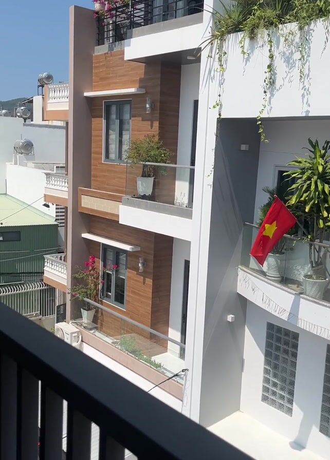 view from a balcony overlooking other buildings in a neighborhood. The architecture is modern with white and brown accents, and some buildings feature glass block windows. Balconies are adorned with various plants. One balcony has a Vietnamese flag. The video focuses on a small orange tree growing on the balcony from which the video is being taken. The tree has green leaves and several ripe oranges. The sky is blue and clear.