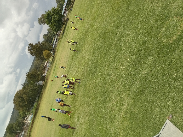 This image depicts an outdoor sports training session or game on a large, green grass field in Nakuru, Kenya