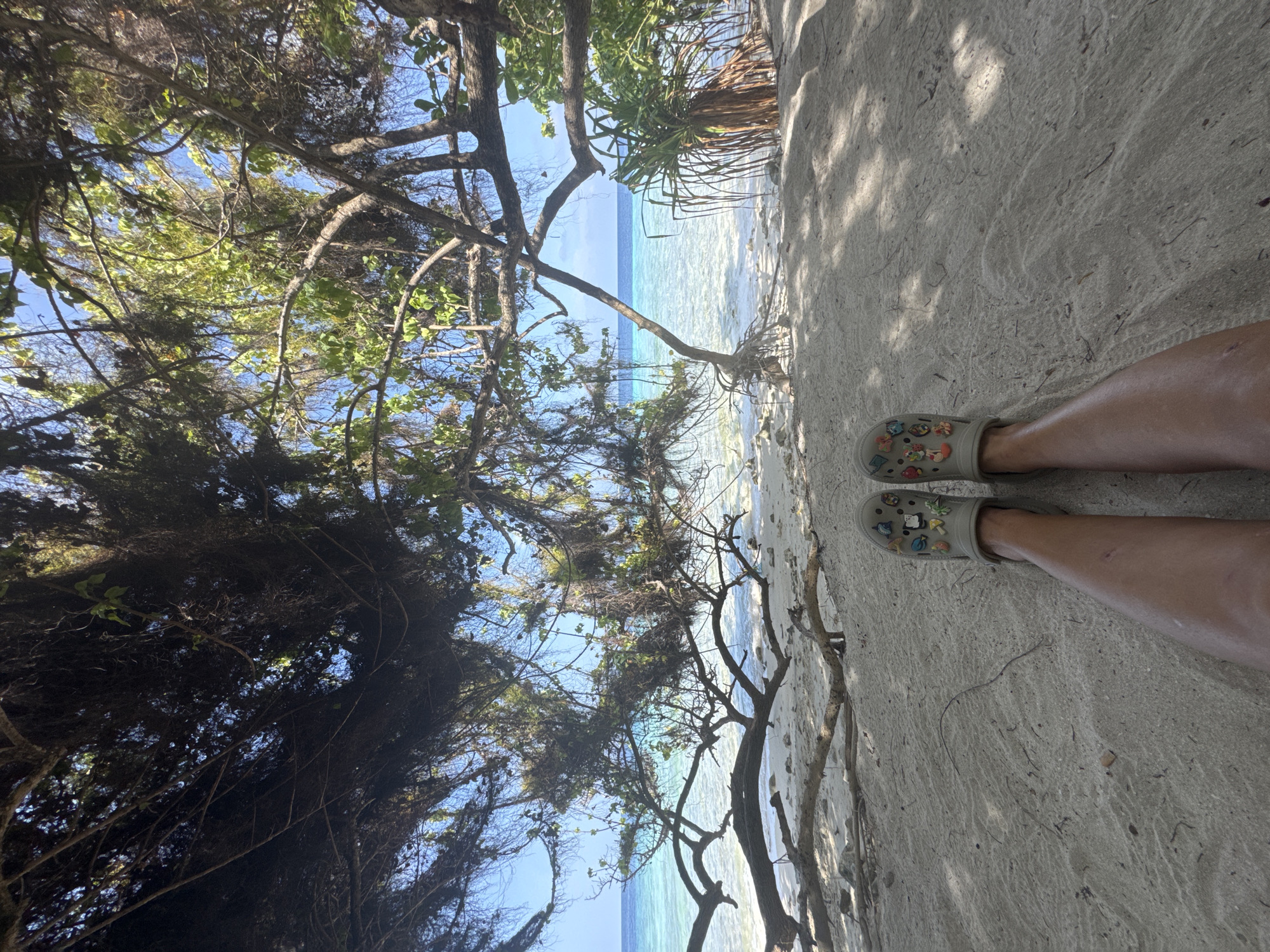The image displays a first-person, ground-level perspective from a shaded beach in Ukulhas, Maldives. The lower legs of an individual are visible in the foreground, extending from the bottom center. The person is wearing light grey Crocs footwear, each adorned with multiple colorful Jibbitz charms depicting various characters and objects. The legs and Crocs are positioned on fine, light-colored sand, which shows patterns of dappled sunlight and shade from an overhead canopy. Beyond the foreground, the sandy beach extends towards the ocean. The mid-ground features clear, shallow turquoise water with minor surface agitation, transitioning to a deeper blue ocean under a clear sky in the background. Bare tree branches with some green foliage extend across the frame, partially obscuring the view of the water and sky. Exposed tree roots and scattered smaller branches are visible on the sand near the waterline. On the right side of the frame, tropical vegetation, including a plant with long, spiky leaves, borders the beach. The top portion of the image is dominated by a dense, dark canopy of tree branches and foliage, providing significant overhead shade. No other individuals are present.