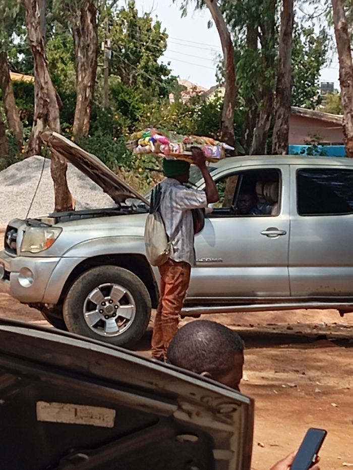 The image displays a daytime roadside scene in Jos, Nigeria. A silver Toyota Tacoma pickup truck is parked on an unpaved, reddish-brown surface with its hood open, indicating it is stationary. Alongside the driver's side of the truck, a dark-skinned male street vendor, wearing a light-colored shirt, reddish-brown trousers, and a green head covering, balances a rectangular wooden tray filled with various packaged goods on his head, supporting it with his right hand. He also carries a light-colored shoulder bag. Inside the truck, a dark-skinned male driver is visible through the open window, looking towards the vendor. To the left of the truck, a large pile of grey gravel or aggregate is present. The background features several tall trees with green foliage and partially visible distant buildings, including a structure with a pink facade. In the immediate bottom right foreground, the top of a dark-skinned individual's head and a hand holding a dark-colored smartphone are partially visible, framed by an open vehicle door or hood.