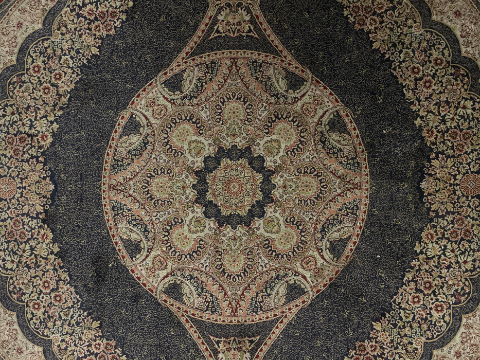 This image presents a detailed overhead view of a densely patterned rug or carpet. The textile features a prominent central medallion, predominantly cream, light green, and dark red, encircled by intricate floral and paisley motifs on a dark blue-black ground. The field surrounding the medallion is a dark blue-black with subtle, lighter-colored swirling vine patterns. An elaborate border system frames the design, consisting of scalloped edges and dense floral clusters in cream, maroon, and light green on a dark background. The overall color palette is rich, combining dark blues, reds, greens, and creams. No people, objects other than the rug, or specific environmental details are discernible. The image provides no visual information regarding its location in Durban, South Africa, or any other city.