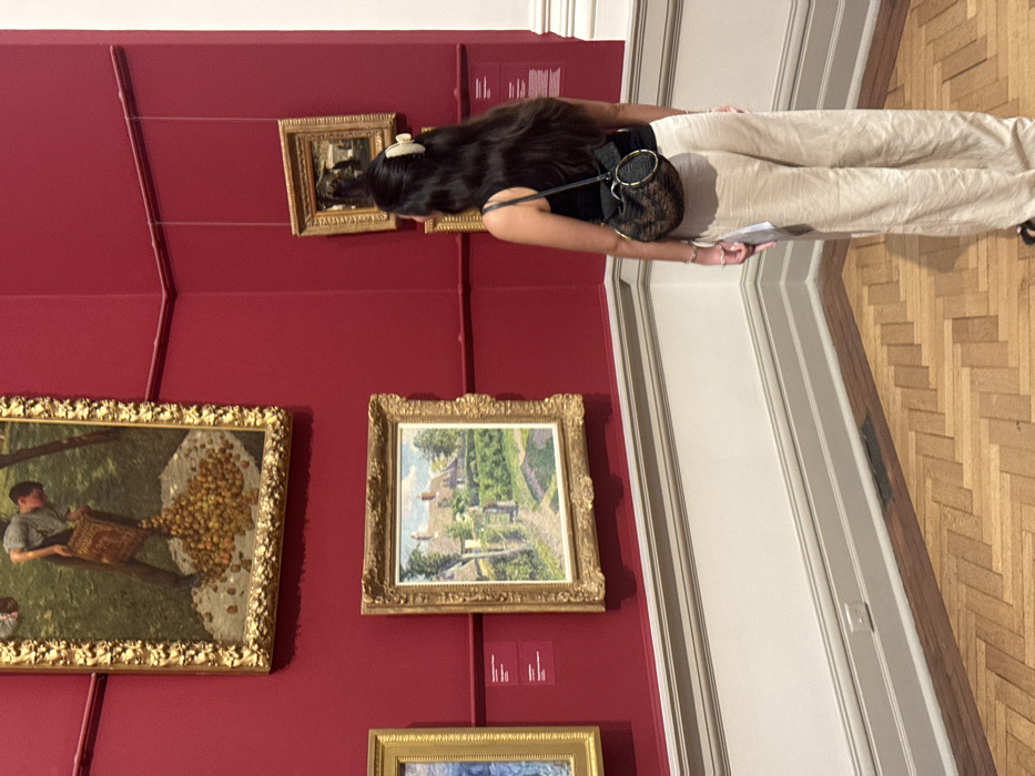 An interior view depicts an art gallery exhibition space at the Art Gallery of New South Wales (AGNSW) in Sydney, Australia. The room features deep red walls with white wainscoting and trim, and a light wood parquet floor laid in a herringbone pattern. Multiple paintings in ornate gold frames are displayed on the red walls. The most prominent artwork, positioned at the upper left, is a large vertical oil painting by George Washington Lambert titled "The Apple Gatherers," depicting a man emptying a basket of apples onto a white sheet. Below it, to the left, is a medium-sized horizontal oil painting by Arthur Streeton titled "The Blue Gums, Heidelberg," portraying a cottage and garden path. A smaller, partially obscured horizontal painting hangs on the wall to the upper right. Small informational plaques are visible below some of the artworks. A female individual is present in the center-right of the frame, viewed from the back. She has long, dark brown hair secured with a light-colored claw clip. She is wearing a black sleeveless top and loose-fitting, light beige trousers. A round, patterned shoulder bag with a dark strap and a prominent circular metal ring detail is worn over her right shoulder. Her right hand holds a small, light-colored item, possibly a brochure or tag. She stands facing the wall, observing the displayed artworks. An electrical outlet is visible on the wainscoting to the left, and a floor vent is near the corner. A white architectural column is partially visible on the far right.