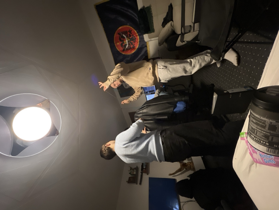 The image depicts an indoor scene within a residential room in Lachen, Germany. Three individuals are present. In the mid-ground, a male subject stands facing partially towards the right, wearing a tan hooded sweatshirt and light grey sweatpants, with visible white socks. He holds a thin, string-like object between the raised fingers of both hands, his facial expression indicating engagement or a slight smile. To his immediate left, another male subject stands with his back largely to the camera, dressed in a light blue sweater and dark trousers, appearing to face towards the first subject or the area beyond him. A black leather jacket is draped over an unseen object positioned between these two individuals. In the far left background, a third subject is seated, silhouetted and wearing a dark hooded garment, facing away from the camera. The room is illuminated primarily by a large, circular white light source enclosed within a diffuser, mounted centrally on the ceiling. On the back wall, an Albanian national flag, dark blue with a red circular emblem featuring a black double-headed eagle, is prominently displayed. Below the flag and to the right, a light-colored sofa is partially visible with a dark item of clothing draped over it. To the left, a flat-screen television is mounted on the wall, displaying a blue-toned image. Beneath the television, a white shelf holds various items, including a light-colored animal skull or horn structure. A computer monitor displaying a graphical interface, consistent with audio production software, is visible behind the standing subjects, accompanied by a desktop computer tower on the floor. The floor is covered with a dark, patterned carpet. In the immediate foreground, resting on a white surface, are a black cylindrical object resembling a camera lens and a pink package labeled "Koshka Gums." A dark, foldable chair is partially visible in the lower right foreground.