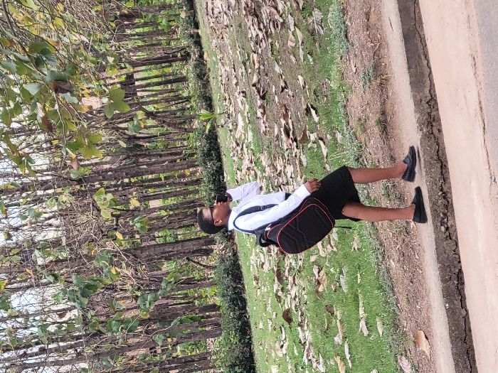 A young woman stands on a walkway near trees and grass. She's wearing a white shirt, a black skirt, and black shoes. A black backpack with red accents is on her back. The walkway is made of dirt and asphalt. The grass has scattered leaves. Trees line the walkway on one side.