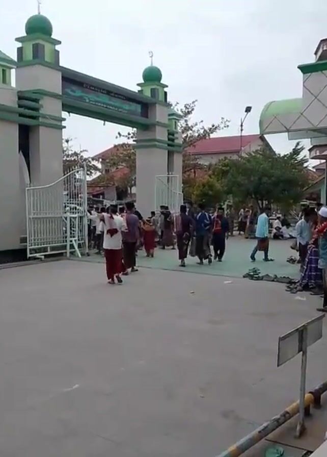 group of people, mostly men, gathered outside what appears to be a mosque. Many of them are wearing traditional clothing. People are walking through a large gated entrance adorned with Islamic symbols and architecture, with others sitting or standing nearby. Numerous pairs of shoes and sandals are scattered on the ground near the entrance, indicating that people have removed their footwear before entering. There are buildings and trees visible in the background. The day appears overcast.