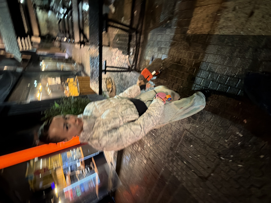 The image depicts a nighttime street scene in a commercial district of Haifa, Israel. The ground is wet cobblestone pavement, reflecting artificial lights, suggesting recent rain. In the foreground, a single individual, appearing to be a young adult, stands facing the camera with a neutral expression. The person wears a light-colored, textured quilted jacket with a high collar, light-colored loose pants, and a black fanny pack around the waist. Large earrings are visible. In their left hand, the individual holds a cluster of colorful items, possibly keychains. In their right hand, they hold an orange, handheld electronic device with a black handle and a dark rectangular base, which has a white sticker. The background on the left features a tall, bright orange vertical architectural or lighting element. Behind it, a storefront with large glass windows displays illuminated interior shelves with various products, suggesting a cafe or shop. A green potted plant is visible near the storefront. On the right side of the background, two dark, rectangular outdoor tables with metal frames, also appearing wet, are visible. Beyond these tables, a narrow, dimly lit alleyway or passage extends between buildings with visible aged facades. The overall scene is lit by artificial urban lighting.