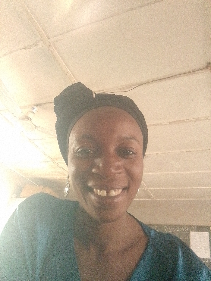 A woman with a dark headwrap smiles at the camera, revealing a gap between her front teeth. She wears a teal top and an ornate earring is visible. The background shows a ceiling with rectangular panels and a partial view of a chalkboard with handwriting and papers attached. The lighting is bright, casting shadows and creating a slightly overexposed image.