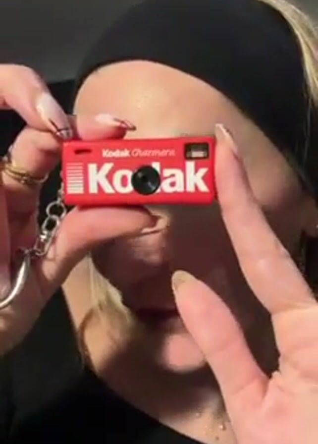 A woman, with fair skin, light blonde hair, dark eyebrows, and red lipstick, holds a small, red Kodak Charm Camera keychain in front of her face