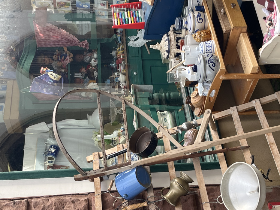 The image presents an outdoor market display in front of a shop window, located in the city of Meisenheim, Germany. In the foreground, a light-colored wooden A-frame ladder with a semi-circular metal top rail stands centrally. To its left, a wooden lattice structure leans against a reddish-brown stone wall, supporting a blue enamel bucket with a wooden handle, a dark metal pot, a brass pitcher, and a large aluminum funnel. To the right of the ladder, a light-colored wooden table features a collection of vintage household items. These include a large lidded stoneware tureen with blue and white decoration, several smaller lidded ceramic pots (one shaped like a beehive), various mugs, pitchers, and wooden kitchen utensils and bowls. A partially open wooden drawer is visible on the table, and a lower shelf displays a wooden box. Behind this outdoor setup, a large glass shop window reflects parts of the environment. Through the window, the shop's interior is visible, dominated by a green display cabinet. The cabinet's upper shelves contain multiple dolls, including a larger figure with an apron, alongside miniature tea sets. A red and white checkered curtain is draped on the right side of the cabinet. Below, a green counter displays an array of miniature items, including tiny chairs and teacups. To the far right within the window, a red abacus with colorful beads is prominently featured next to racks of small printed cards. To the left within the window, behind the outdoor ladder, white ceramic items and artificial white tulips are arranged on a shelf, with blue-patterned mugs hanging on a pegboard. No people are visible in the scene.