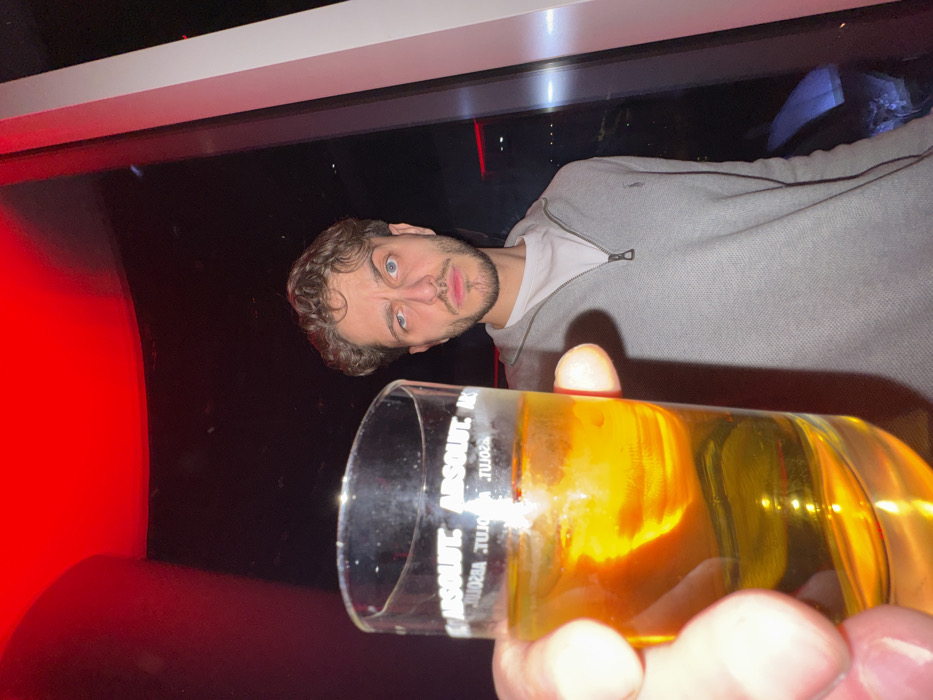A man with blue eyes and a slight beard holds a glass filled with a yellow liquid, possibly beer or a mixed drink. The glass has the "Absolut" logo on it. He wears a gray zip-up sweater over a white t-shirt. The background is dark with red lighting on the left and a window showing a building at night on the right. The picture is taken from a low angle.