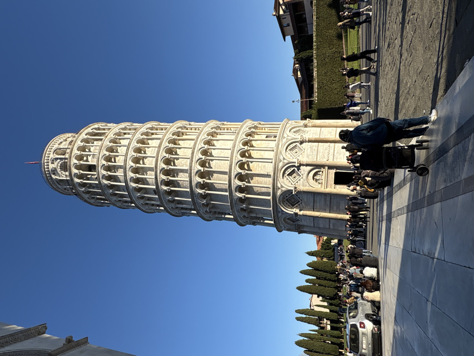 - "The image depicts the Leaning Tower of Pisa, a white marble bell tower, prominently positioned under a clear, bright blue sky in Pisa, Italy" by FM-E1hwL2, licensed under CC BY 4.0