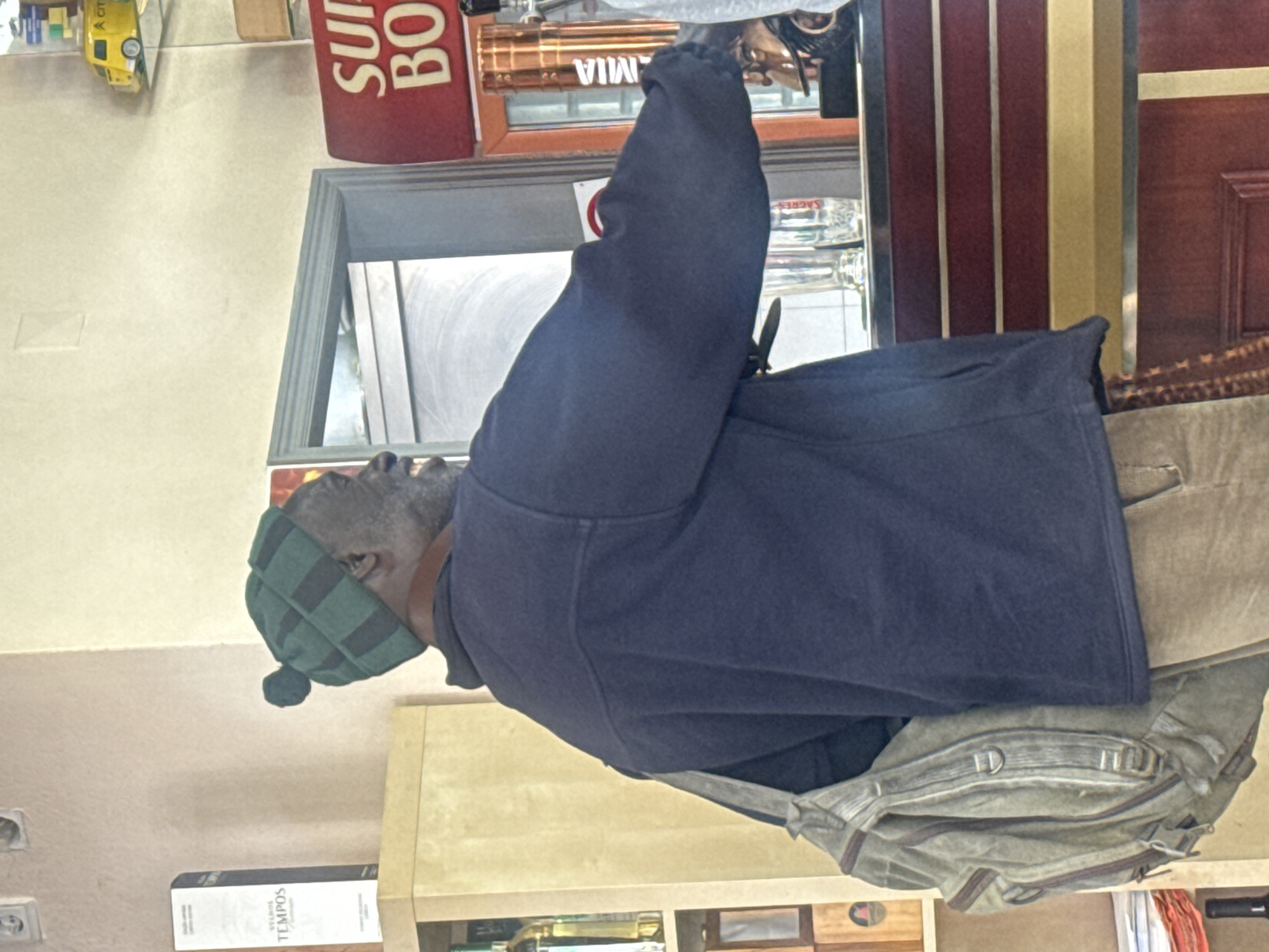 An adult male of dark complexion, with a greyish beard, stands at a bar counter, viewed from his back and right side. He wears a green and black striped beanie with a pompom, a dark blue long-sleeved jacket, and light brown trousers, carrying a greyish-green canvas backpack over his left shoulder. His right arm is extended towards a bronze-colored beer tap system on the dark reddish-brown and gold-striped counter. Adjacent to the tap is a red-framed cooler with "SUP BO" (Super Bock) and "MIA" (Bohemia) visible. Two clear glasses, one marked with "SAGRES," are on the counter. To the left, a light wooden shelving unit holds a white box labeled "VELHOS TEMPOS." The background features light beige walls and a light blue-framed doorway. A small yellow model van is displayed on a high shelf to the upper right. The scene depicts the interior of a commercial establishment in Torres Vedras, Portugal.