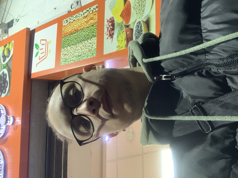A man wearing glasses and a dark jacket is standing in front of a shop. The shop's wall is decorated with food pictures. The man is looking directly at the camera. The image is rotated 90 degrees to the right.