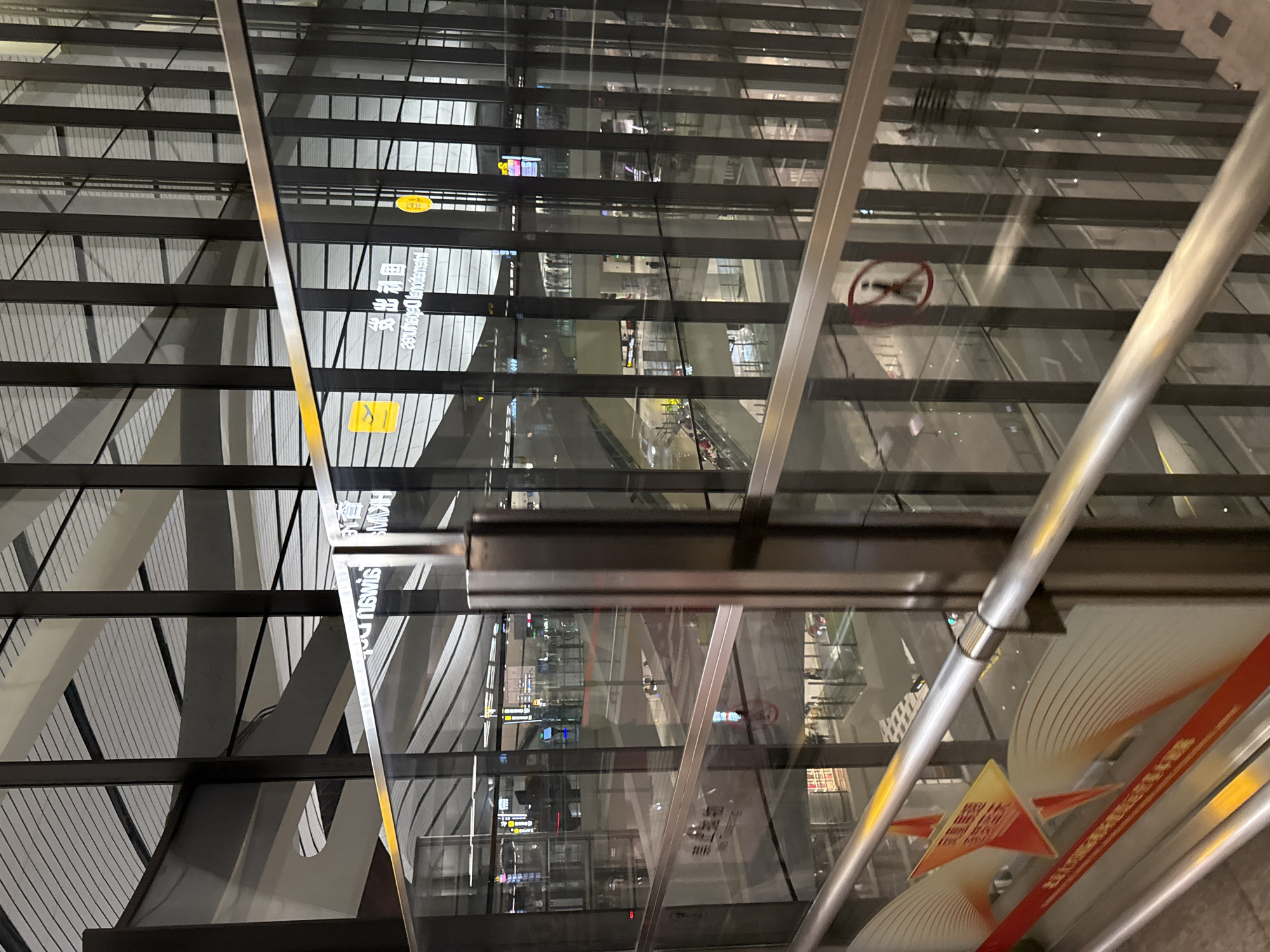 This photo shows an interior view, likely within the Beijing Daxing International Airport, located in Langfang, China. The focus is on the architectural details, with a strong emphasis on the glass surfaces reflecting the surrounding environment. The reflections include structural beams, signage in Chinese characters, and glimpses of the airport's interior, indicating commercial establishments and passenger areas. The image is composed of sharp lines and layered reflections, creating a complex visual texture. There are no visible people, actions, or explicit interactions within the immediate frame. The lighting is ambient, contributing to the overall indoor setting.