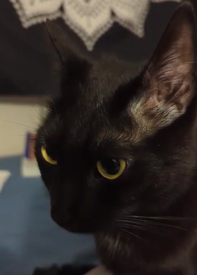 A close-up shot shows a black cat with yellow eyes, its head slightly turned to the left
