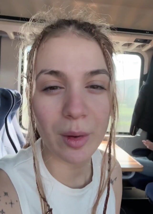 A woman films herself in a train cabin. She wears a white tank top, and her light brown hair is in loose braids. She turns the camera to show another woman sitting behind her, in a black shirt with a denim jacket. The other woman has dark hair and sits passively, looking at a phone. A table is in between them with items on it, including a light blue tote bag, a pink object, and an identification card. The first woman makes a peace sign at the camera. The train windows are visible in the background.