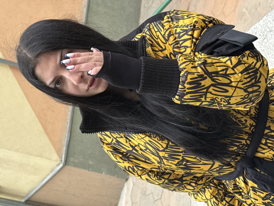 A female subject is depicted outdoors in Strelcha, Bulgaria, looking directly forward. She has long, dark hair and blue-green eyes. Her left hand is raised, partially obscuring the left side of her face with her fingers. She wears long, white-tipped fingernails with blue accents on some, and a single black-tipped nail. She is dressed in a yellow puffer jacket patterned with black graffiti-style script, featuring a black ribbed collar, black ribbed cuffs, and a black fabric belt tied at the waist. A black fingerless glove or wrist warmer covers her left hand and wrist. The background features a building facade with angular sections painted in light yellow, light orange, and light olive green. A light grey paved surface is visible in the lower right, with a green pipe or hose faintly present behind it.