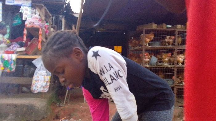 A young girl, with dark braided hair, is depicted bending forward and looking downwards in what appears to be an outdoor market setting in Onitsha, Nigeria