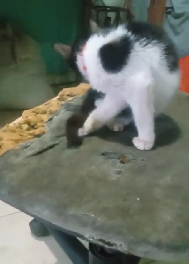 A medium shot depicts a black and white cat wearing a red collar, sitting on a gray cushion placed on top of a black-legged stool