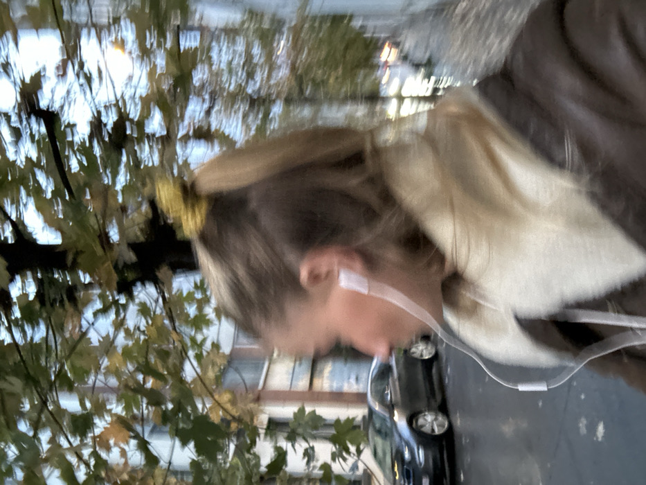 The image depicts an urban street scene in the city of Ixelles - Elsene, Belgium, captured with significant motion blur, suggesting movement during photography. In the foreground, the left profile of a person, likely female, is partially visible, facing towards the right. Her light brown hair is tied into a high ponytail secured with a yellow scrunchie. A white wired earbud is inserted into her left ear, with a visible white cable extending downwards. She is wearing a brown jacket with a prominent cream-colored shearling or faux fur collar. In the background, a wet asphalt street surface is visible on the left, indicating recent rain. A dark grey car, resembling a BMW i3, is parked or moving slowly alongside the street. Behind the street and car, multi-story urban buildings with windows are partially discernible. Overhead, a tree with green and golden-yellow autumn leaves occupies the upper portion of the frame, silhouetted against a blurred light blue and grey sky.