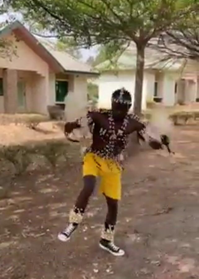 A young Black man performs a traditional dance in an outdoor setting. He is dressed in a traditional costume that includes a beaded headpiece, a beaded harness across his torso, yellow shorts, beaded anklets, and black high-top sneakers. He carries a white feathered fan in one hand. The dance involves energetic steps and arm movements. The background includes a dirt path with sparse vegetation, trees, and buildings with green trim. A parked car is visible further in the background. The scene is well-lit and filmed on a clear day.