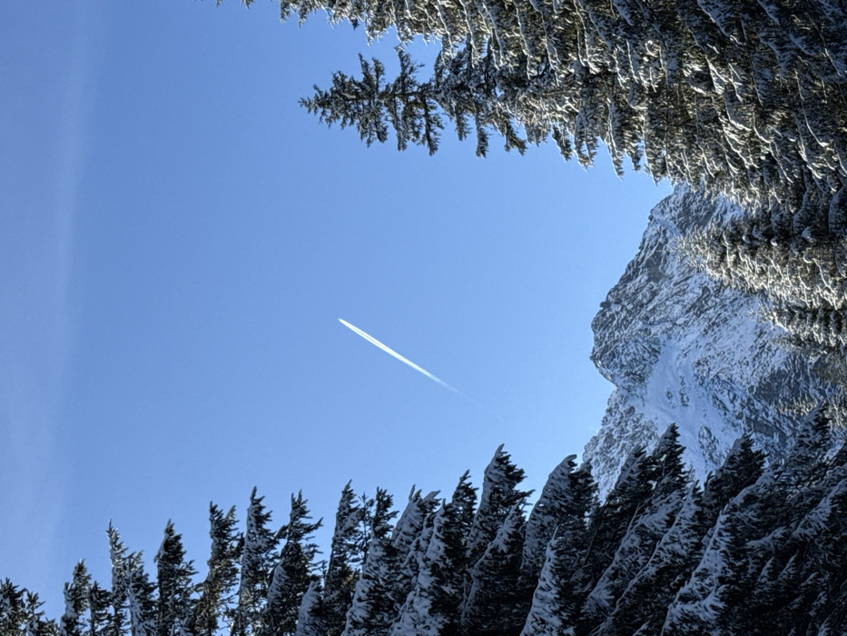 The image displays a clear winter mountain landscape, observed in the vicinity of Brzegi, Poland. The scene is framed by two prominent evergreen trees, heavily laden with white snow, positioned on the left and right sides of the foreground. Between these snow-covered trees, rugged, snow-capped mountains rise under a brilliant, cloudless blue sky. A single, white aircraft contrail is visible diagonally across the upper portion of the sky, extending from the lower-left towards the upper-right quadrant. No individuals, artificial structures, or objects other than the implied aircraft (via contrail) are present. The environment indicates a cold, sunny day in a mountainous, forested region.