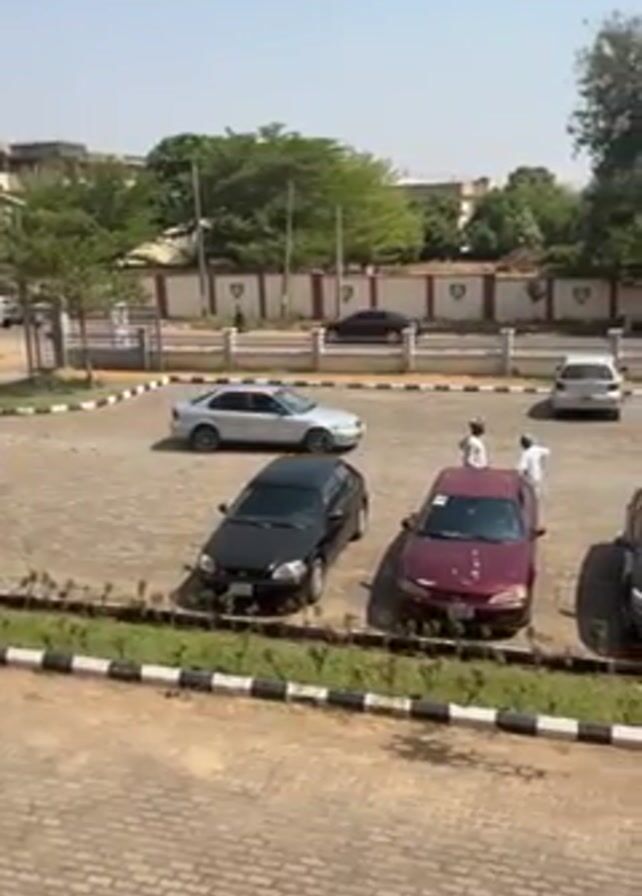 parking lot on a bright, sunny day. Several cars of various makes, models, and colors are parked in designated spaces. Some of the cars are a silver sedan, a black hatchback, and a maroon sedan. A few men wearing white robes can be seen standing and interacting near some of the parked cars. The parking lot is paved with grey bricks and is bordered by a low, black and white painted curb with grass and small shrubs planted along it. In the background, there's a low building with a white fence, and further back are some houses and trees. The camera is stationary and provides a high-angle view of the parking lot.