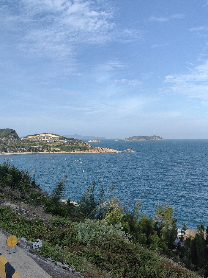 This image captures a panoramic coastal scene within Tuy Phong 4, Vietnam, under clear daylight conditions. The foreground, specifically the bottom left quadrant, displays the edge of a concrete or paved surface, marked by a yellow and black striped bollard or barrier. Immediately beyond this, a dense layer of green and brown low-lying vegetation, scrub, and scattered small trees covers a rocky hillside sloping towards the water. The midground is dominated by a wide expanse of deep blue ocean water, exhibiting minor surface ripples. Approximately two dozen small, light-colored boats, some with visible white buoys nearby, are distributed across a bay on the left side of the water. The coastline along this bay features a sandy beach fringed with palm trees. Ascending from the beach, a prominent green hill is visible, hosting a cluster of multi-story buildings, likely a resort or residential complex, characterized by light-colored facades and dark roofs, interspersed with vegetation. Further along this coastline, red-brown rocky headlands and smaller islets extend into the ocean. In the background, several larger, dark green islands or distant landmasses emerge from the ocean on the right, receding towards the horizon. The sky, occupying the upper half of the image, is a clear, bright blue with scattered, wispy white clouds. No human figures are identifiable.