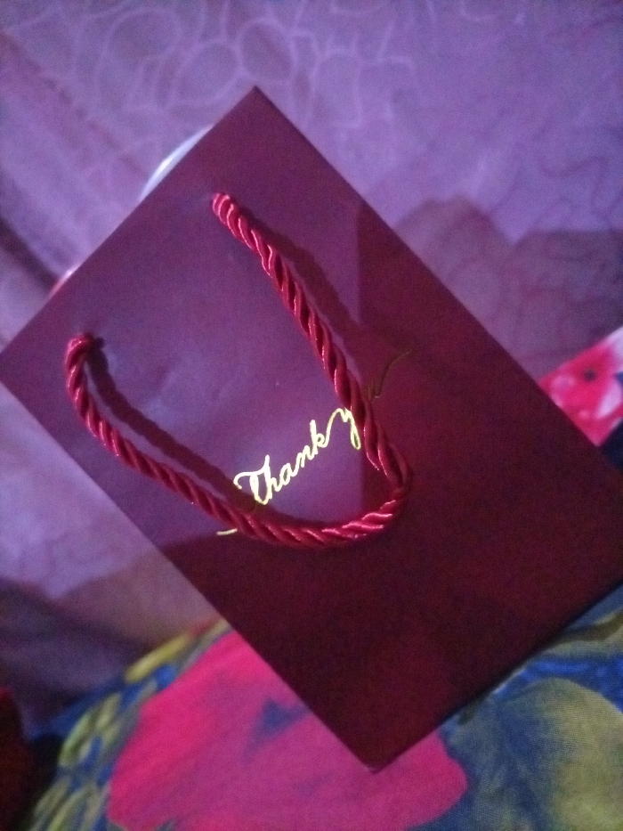 A maroon gift bag rests at an angle, its handles made of twisted red rope. Golden script spelling "Thank you" adorns the bag's surface. The bag sits partially on a patterned fabric featuring pink flowers and blue swirls. Soft, diffused light gives the scene a slightly purple hue, particularly on the textured fabric visible in the background. The composition is close-up, focusing primarily on the gift bag and its immediate surroundings.