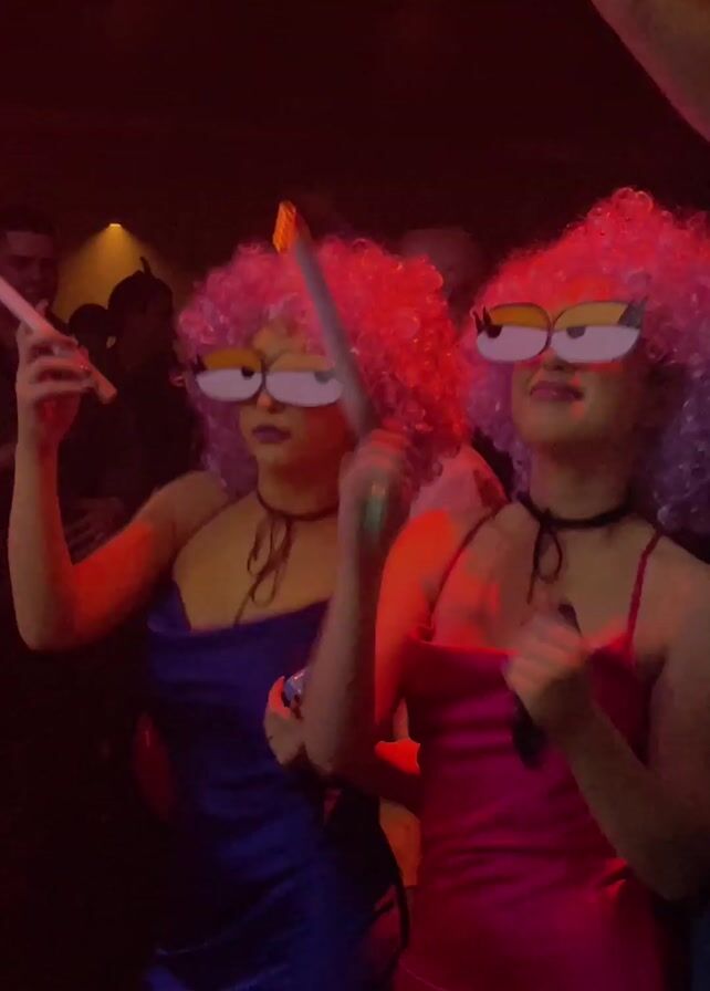 Two young women, dressed in colorful outfits and wigs, dance and cheer in a crowded nightclub. The woman on the left wears a short, blue satin dress with thin straps, and the one on the right wears a similar dress in pink. Both have matching curly wigs, one lavender and the other lime green. They sport large, novelty eyeglasses with cartoonish eyes and eyelashes. The women are holding what appear to be vaping devices. People can be seen in the background, some dancing. The room is dimly lit with spotlights and strobe lights creating an energetic atmosphere.