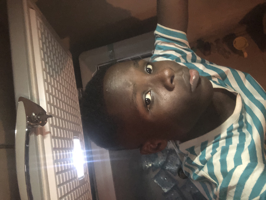 A dark-skinned person in a blue and white striped shirt looks at the camera. The individual's face is prominently displayed with dark hair. To the left, a tall, textured white object with a chrome handle is visible, casting a bright light. The background is dark and somewhat indistinct.