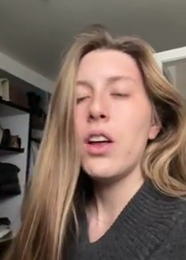 A woman with long, light-brown hair and a gray sweater is singing while looking up. Her eyes are partially closed, and her mouth is open. Behind her, there is a closet with clothes and shoes. The ceiling is white and has a light fixture. A partial doorway is seen on the right.