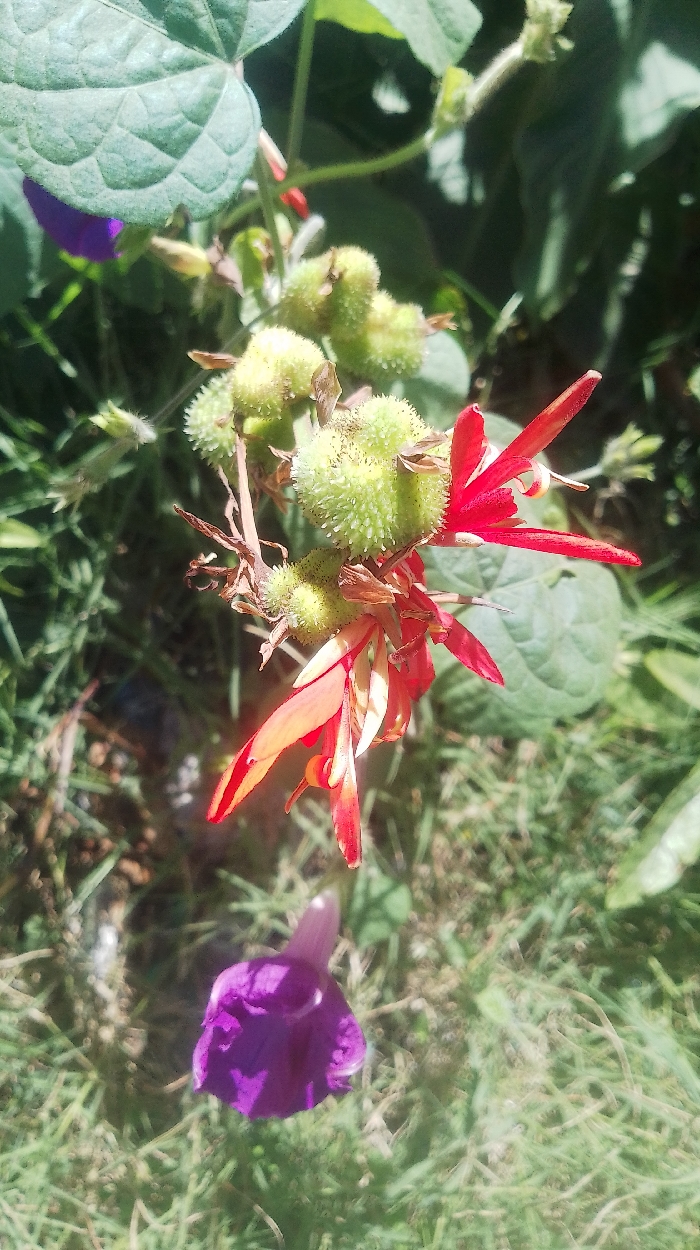 The image displays a close-up, upward-angled view of flora in Nairobi, Kenya, under bright, direct sunlight. The central focus is a plant stem featuring a cluster of approximately six round to oval, light-green, spiky seed pods, each measuring about 2-3 cm in diameter. Interspersed among these pods are several vibrant red-orange flowers with elongated, pointed petals, some appearing fully open, others partially unfurled. A large, dark-green leaf with prominent venation is visible in the upper-left background, providing context for the foliage. In the lower-left foreground, a single purple-blue flower, slightly out of focus, rests on green grass. The surrounding environment consists of green grass and additional green foliage, consistent with an outdoor natural setting. No people, animals, or man-made objects are present, and no specific actions or interactions are depicted.