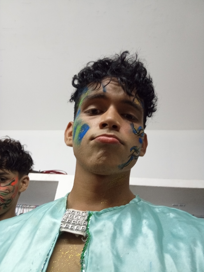 A young man with dark curly hair and face paint stands in the foreground. The paint includes blue, green, and glittery designs on his forehead and cheeks. He wears a light blue, open-front garment with a decorative, silver-colored clasp. A second person with similar face paint is partially visible in the lower left corner. The background appears to be a plain white wall.