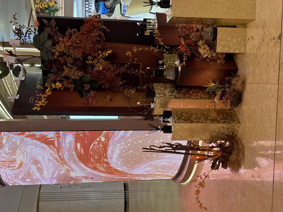 This image depicts a commercial fragrance and home scent display within a modern, upscale indoor retail environment, likely a shopping mall in Shanghai, China. The central feature is a multi-tiered promotional display, identified by text as a collaboration between "瑞德元境" (Ruide Yuanjing) and "MAISON 21G PARIS" on a dark brown vertical panel. This panel serves as a backdrop, heavily adorned with a dense arrangement of artificial or preserved foliage and flowers in autumnal hues of red, orange, yellow, and deep green. White clips are visible near the top of the panel, suggesting mounting points. In front of the panel, several pedestals of varying heights and materials are arranged. Gold-colored, textured rectangular pedestals display dark glass diffusers with reeds and dark-colored candles. Dark reddish-brown pedestals feature additional diffusers, small bottles, and clear ribbed glass cloches, some illuminated from within. The base of the display incorporates decorative elements such as driftwood, tall dark sticks, and dried natural fibers, interspersed with more floral and foliage arrangements, including tropical-style blooms. To the left of the main display, a tall, curved LED screen emits a vibrant, abstract pattern of swirling orange, red, and white light. The polished, light-colored tile or marble floor reflects the display elements. In the blurred background to the right, a partially visible blue vehicle and light-colored seating suggest another retail or lounge area within the expansive interior space. No individuals are clearly visible interacting with the display or in the immediate foreground.