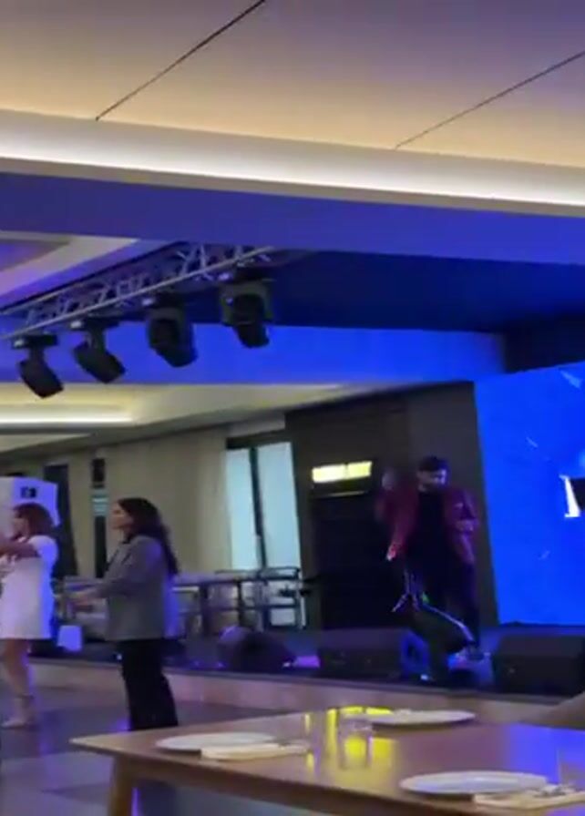group of women dancing in a brightly lit room with a modern ceiling. The ceiling features recessed lighting and stage lights that alternate between green and purple. There is stage equipment, like speakers, visible near the ceiling. The women are dressed in casual clothing and appear to be enjoying themselves. The room has a neutral color palette with beige furniture visible in the foreground and large windows in the background. The camera pans around the room.