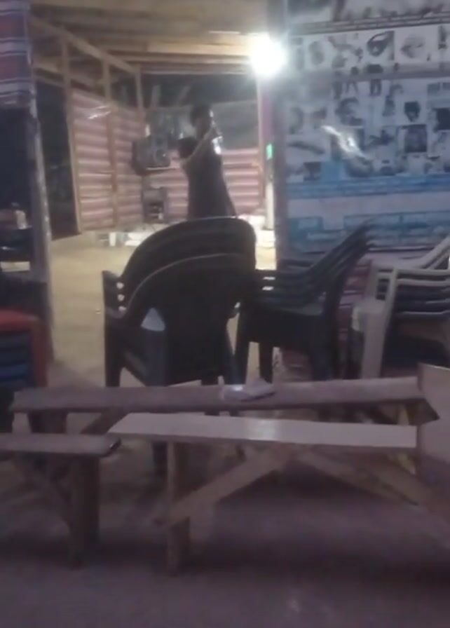 n indoor or sheltered area, possibly a restaurant or a gathering space, with wooden benches and stacked plastic chairs in the foreground. A woman in a dark dress is standing and drinking from a cup or glass. Behind her are posters on a wall and another person moving in the background. The area appears dimly lit, with some light sources creating glare.