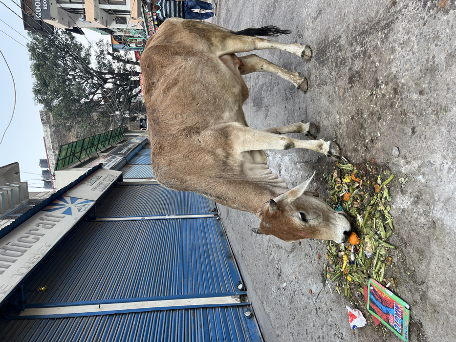 - "A light brown Zebu cow, with a faint reddish mark on its forehead, stands on a grey concrete or asphalt street, consuming discarded food waste" by FM-fZXFa2, licensed under CC BY 4.0
