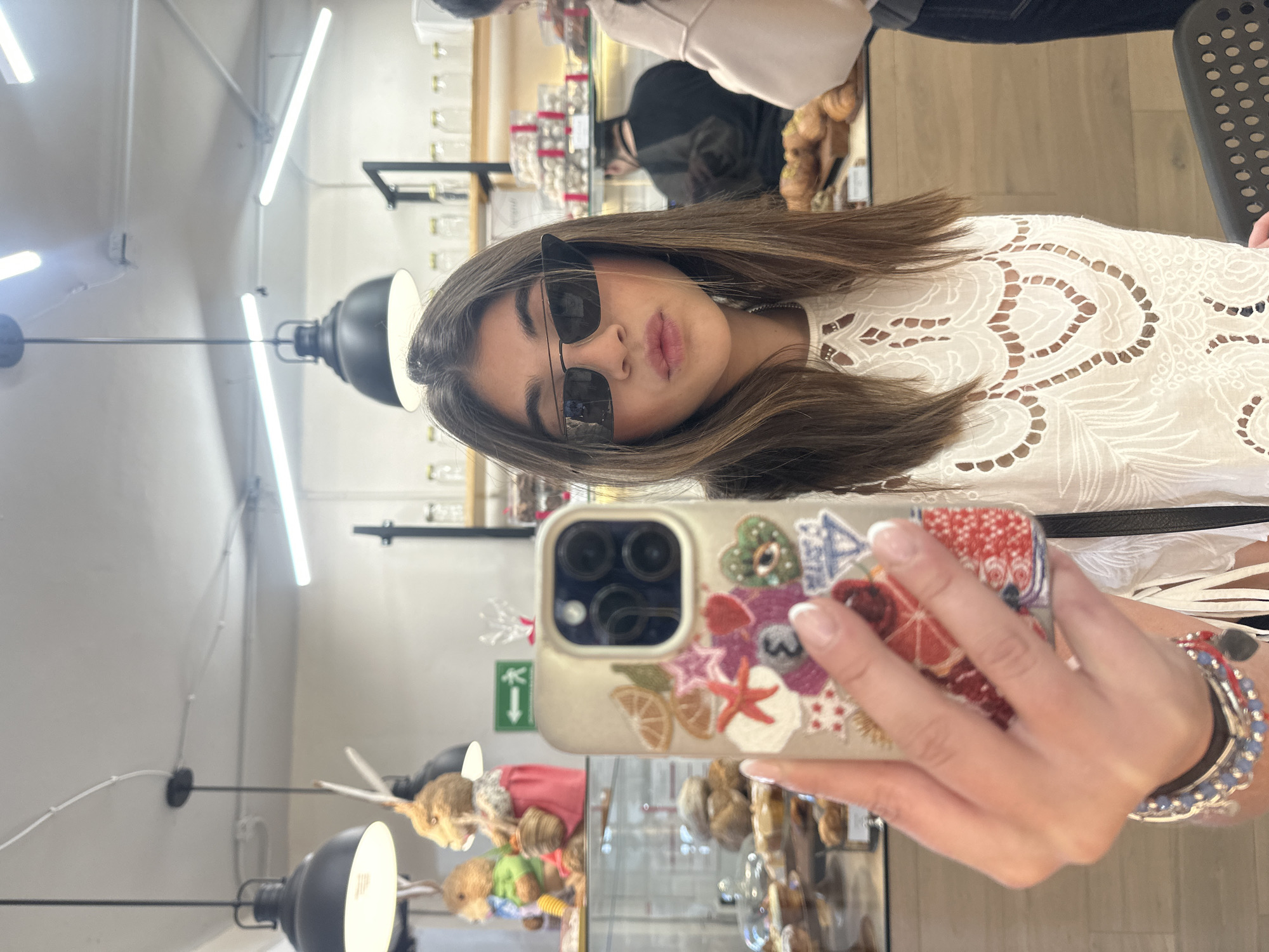 A woman takes a selfie in what appears to be a bakery or pastry shop. She is wearing sunglasses and a white, lacy top. Her phone has a decorative case with various embellishments. The background shows shelves stocked with pastries and other bakery items, with some stuffed animals also visible. Based on the green exit sign and the overall aesthetic, it is possible this scene is located in a bakery or cafe in Mexico City, Mexico. The presence of both pastries and stuffed animals suggests a potentially unique or themed business.