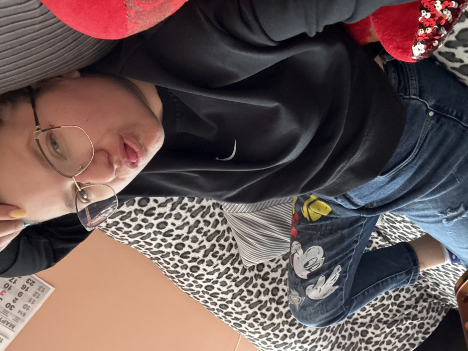 An individual is depicted lying on a leopard-print surface, likely a sofa or bed, in an indoor setting. The person, appearing to be female, wears rectangular gold-framed glasses, a black long-sleeved top with a white Nike swoosh logo on the chest, and blue jeans adorned with white and yellow cartoon character designs, resembling Mickey Mouse. Her hair is pulled back, and her left hand, with light yellow nail polish on the visible fingernails, rests near her head. Her mouth is slightly open with her tongue subtly protruding. Behind her head is a grey and white striped cushion. To her right, a red object covered in sequins is partially visible. In the upper left background, a light peach-colored wall is visible, on which a white calendar page is affixed. The calendar displays "МАРТ" (March) in Cyrillillic script, with various dates including "10, 11, 12, 13, 14, 15, 16" and "23". The location is identified as Sofia, Bulgaria.