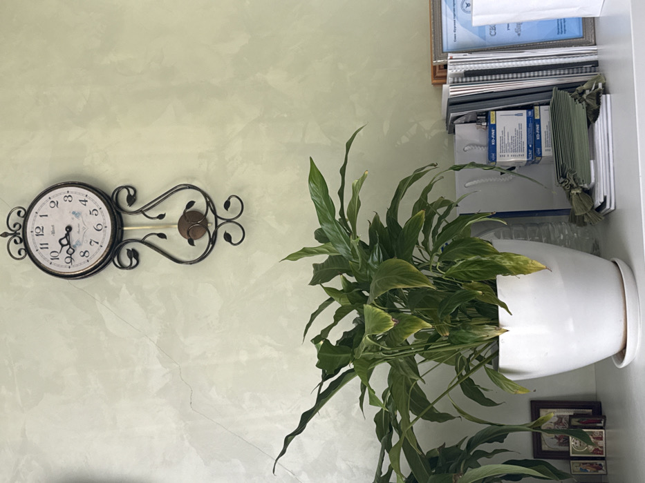 The image depicts an indoor scene in Kursk, Russia. This is confirmed by a partially visible framed document on a shelf to the right, displaying Cyrillic text beginning "Союз Курской" (Union of Kursk). The environment features light green, textured walls with subtle hairline cracks visible, particularly in the upper left quadrant. Mounted centrally on the wall is a black, ornate wall clock with a pendulum. The clock face has Roman numerals and indicates approximately 8:45. The brand name "Mocck" and "Since 1950" are visible on the dial. Below the clock, a large, leafy plant is situated in a white ceramic pot with a matching saucer, resting on a white shelf or desk. The plant exhibits predominantly green foliage, with several leaves showing signs of yellowing or browning. On the white surface to the left of the plant, two small framed religious icons are partially visible. To the right of the plant, various objects are arranged: a stack of white paper bags, several small white and blue boxes labeled "BD K-FINE" (consistent with medical supplies), a stack of green folded items adorned with tassels, and a collection of books, binders, and notebooks, alongside the aforementioned framed document. No individuals are present in the frame, and no actions or interactions are depicted.