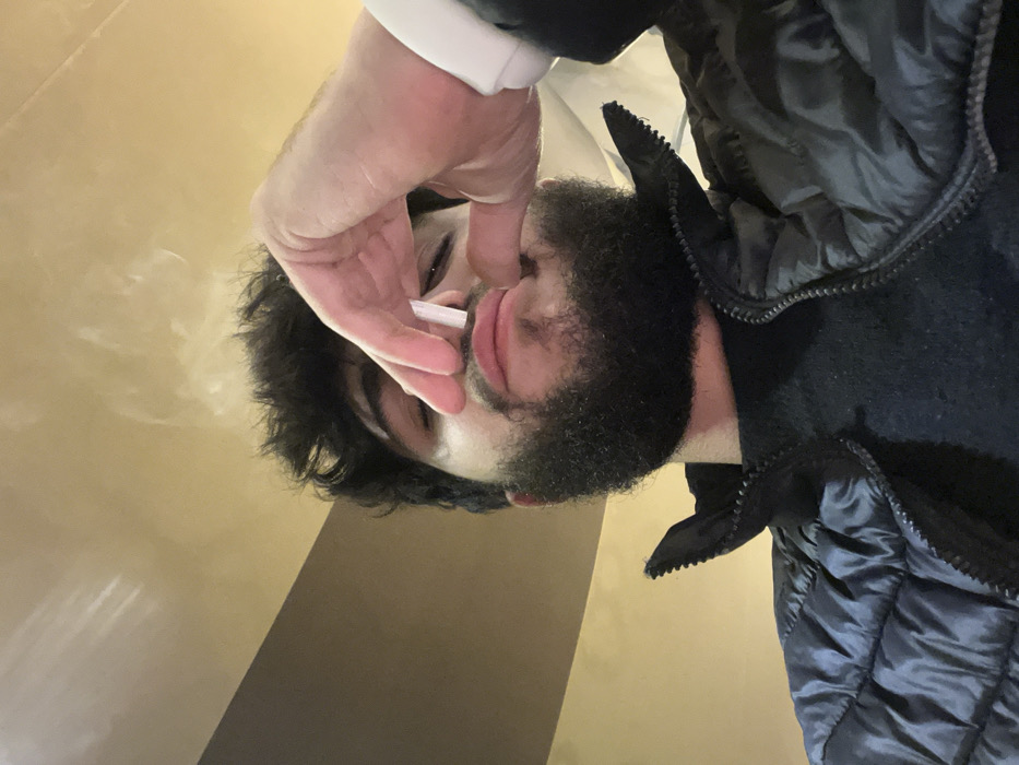 An upside-down shot shows a person with dark hair and a beard, wearing a black puffer jacket and a white collar underneath. The individual has a thin, white object (likely a cigarette) between their lips, held in place by a hand. The background is a plain, light-colored surface. The perspective is from below, looking up at the person.