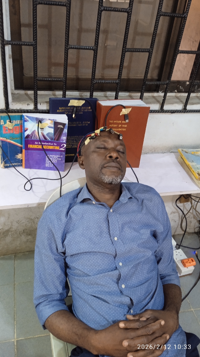 The scene depicts an adult Black male, estimated to be middle-aged, seated indoors with his eyes closed. The location is in Ikeja, Nigeria. He wears a blue long-sleeved collared shirt with white polka dots and has a short beard and mustache. Multiple small, light-colored devices, resembling electrodes or sensors, are affixed to his scalp with light-colored adhesive tape. Thin black wires extend from these devices, leading towards a white table situated directly behind him. His hands are clasped in his lap. On the white table, several hardcover books are positioned upright. From left to right, visible titles include "A Grammar of English...", "An Introduction to FINANCIAL ACCOUNTING 2nd Edition," "SUPERVISED MACHINE LEARNING ALGORITHMS FOR FAULT DETECTION OF INDUSTRIAL..." (a dark blue book referencing "COMPUTER ENGINEERING"), and "THE NATURE AND HISTORY OF MASS COMMUNICATION" (a brown book). Wires connected to the man's head are arranged around these books. To the man's right, on the light grey tiled floor, a white multi-outlet power strip is visible with an orange plug inserted. The background behind the table features a window secured by a dark, wrought-iron grid of security bars. The timestamp on the image indicates it was captured on 2026/2/12 at 10:33.